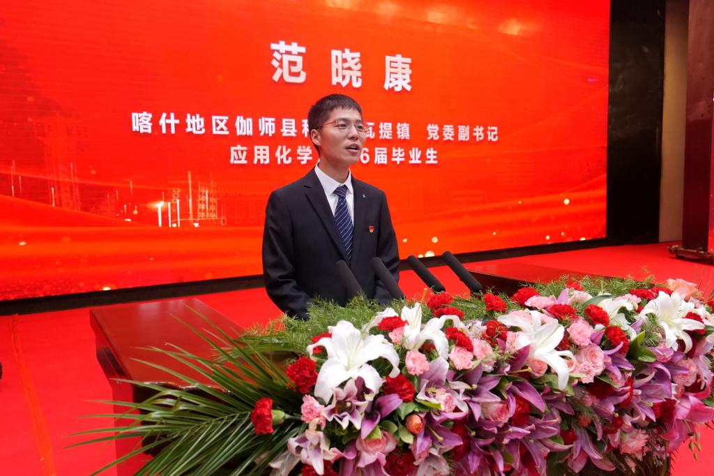 校友代表、生命科学与技术学院应用化学专业2016届毕业生、喀什地区伽师县和夏阿瓦提镇党委副书记范晓康发言时说,回想四年的大学生活,是“艰苦奋斗、自强不息、扎根边疆、甘于奉献”的胡杨精神和恩师们的言传身教,让我在毕业之际毅然决然选择留在了南疆、留在了基层。作为胡杨学子,我将牢记母校的教诲,把基层群众对美好生活的向往作为我的奋斗目标,在基层这个广阔平台上不断历练和成长、发光发热。