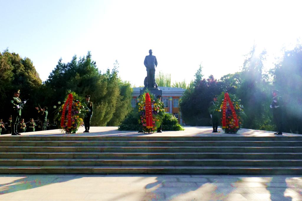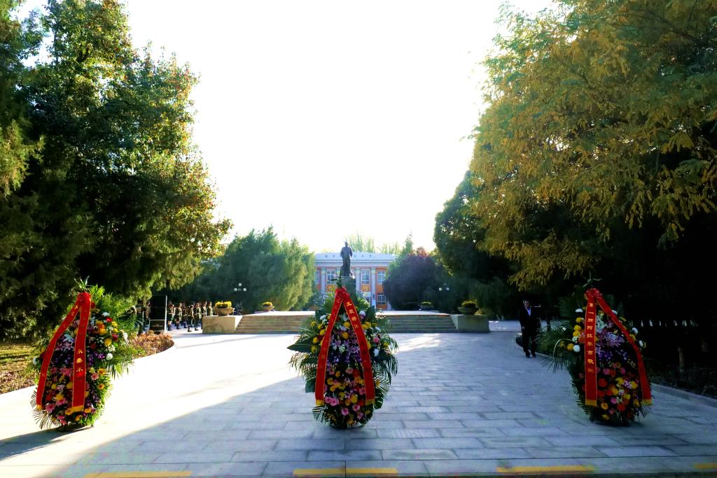英雄不朽,精神永存。在秋天朝露的映衬下,红色文化广场中央,王震将军铜像巍然耸立,广场两旁松柏傲然挺立。铜像基座上白菊等鲜花,寄托着全体塔大儿女对英烈的深情追思。